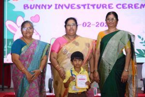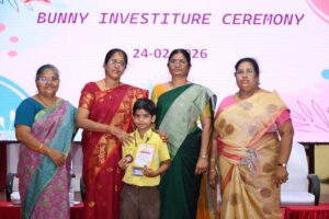 The Bunny Investiture Ceremony was held on Tuesday, 24th February 2026 at Sitaram Hall. Mrs. Jayaganthi Ramesh, Academic Supervisor, Art Education & Work Experience Dept., was the Chief Guest. Mrs. M.V. Mahalakshmi, our beloved Principal, Mrs. Pameela William, Assistant Headmistress and Coordinator of Group A activities, and Mrs. B. Kala, Assistant Headmistress, graced the occasion. The Bunnies of Std II compered the program, which included the enrollment of the UKG Bunnies into the movement. Winners of various competitions were awarded medals and certificates. The variety entertainment included a dance, a skit, and a song.